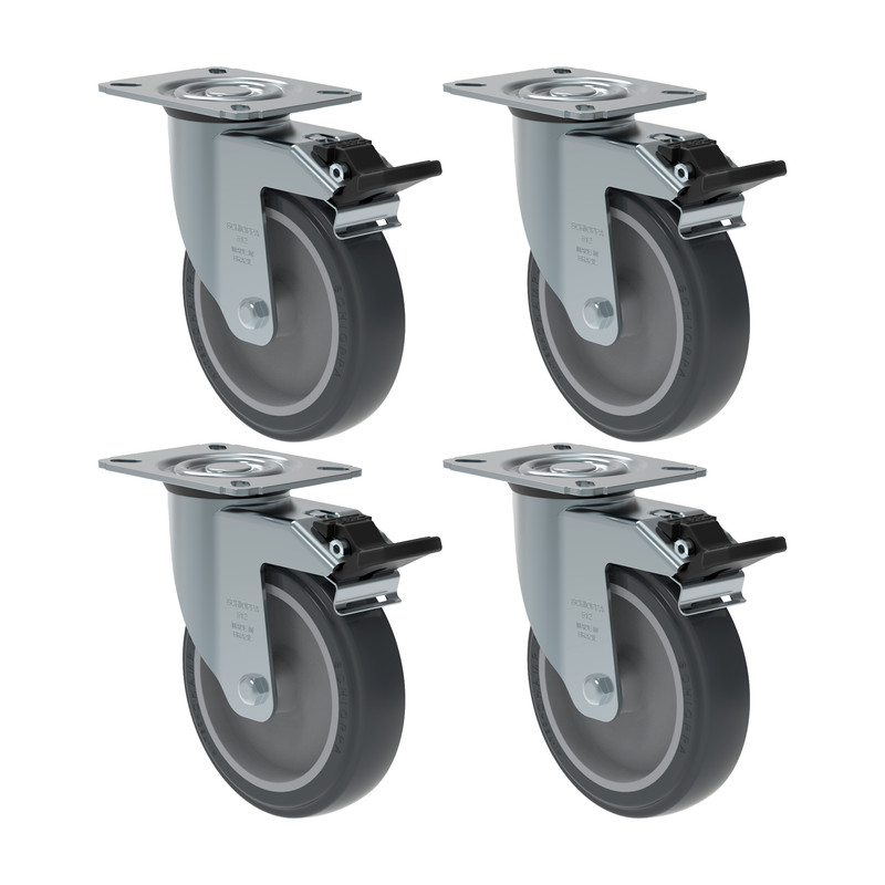 Roda BP: Produzida em composto termoplástico de PVC, com dureza de 85 Shore A (resistência de -10°C a +50°C). Proporciona uma rodagem suave e silenciosa, excelente proteção ao piso, alta resistência química, além de boa durabilidade contra desgaste e impactos, garantindo uma ótima relação custo-benefício.