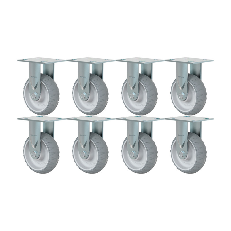 Roda STR – Borracha dureza 70 Shore A (-20°C a +70°C) produzida com revestimento em borracha e núcleo em polipropileno copolímero recicláveis. O perfil da banda de rodagem possui desenho em forma de estrias que permite maior aderência em pisos internos e externos. Proporciona rodagem macia e silenciosa, ótima proteção ao piso, excelente resistência química, boa resistência ao desgaste e impactos. A velocidade de trabalho indicada é até 4km/h.