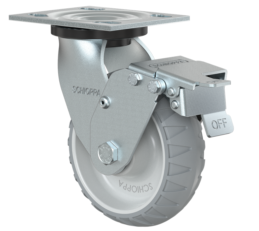Roda STR: Fabricada com revestimento de borracha termoplástica e núcleo em polipropileno reciclável, com dureza de 70 Shore A (resistência de -20°C a +70°C). A banda de rodagem tem um perfil com estrias que aumentam a aderência em pisos internos e externos. Proporciona uma rodagem suave e silenciosa, protegendo o piso, com alta resistência química, ao desgaste e a impactos. Ideal para velocidades de até 4 km/h.
